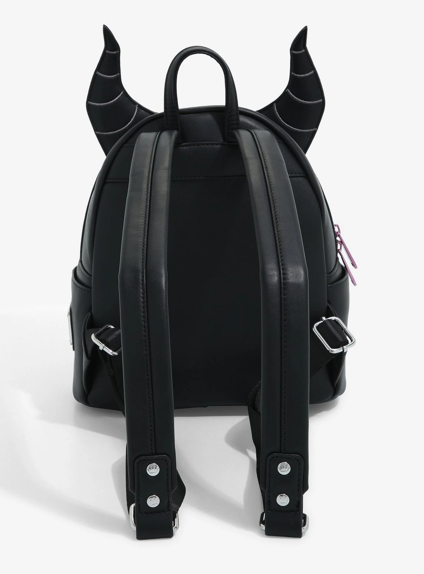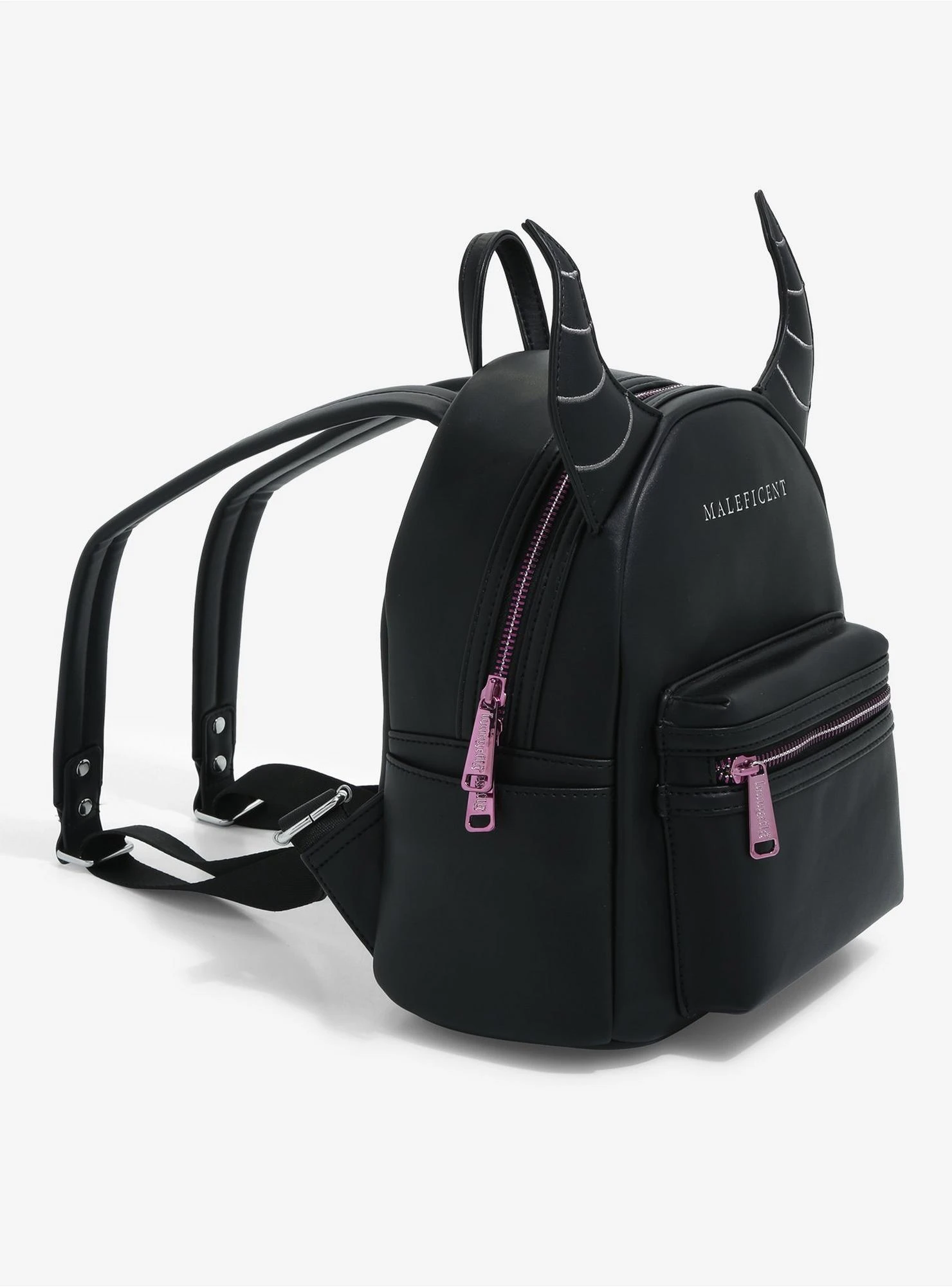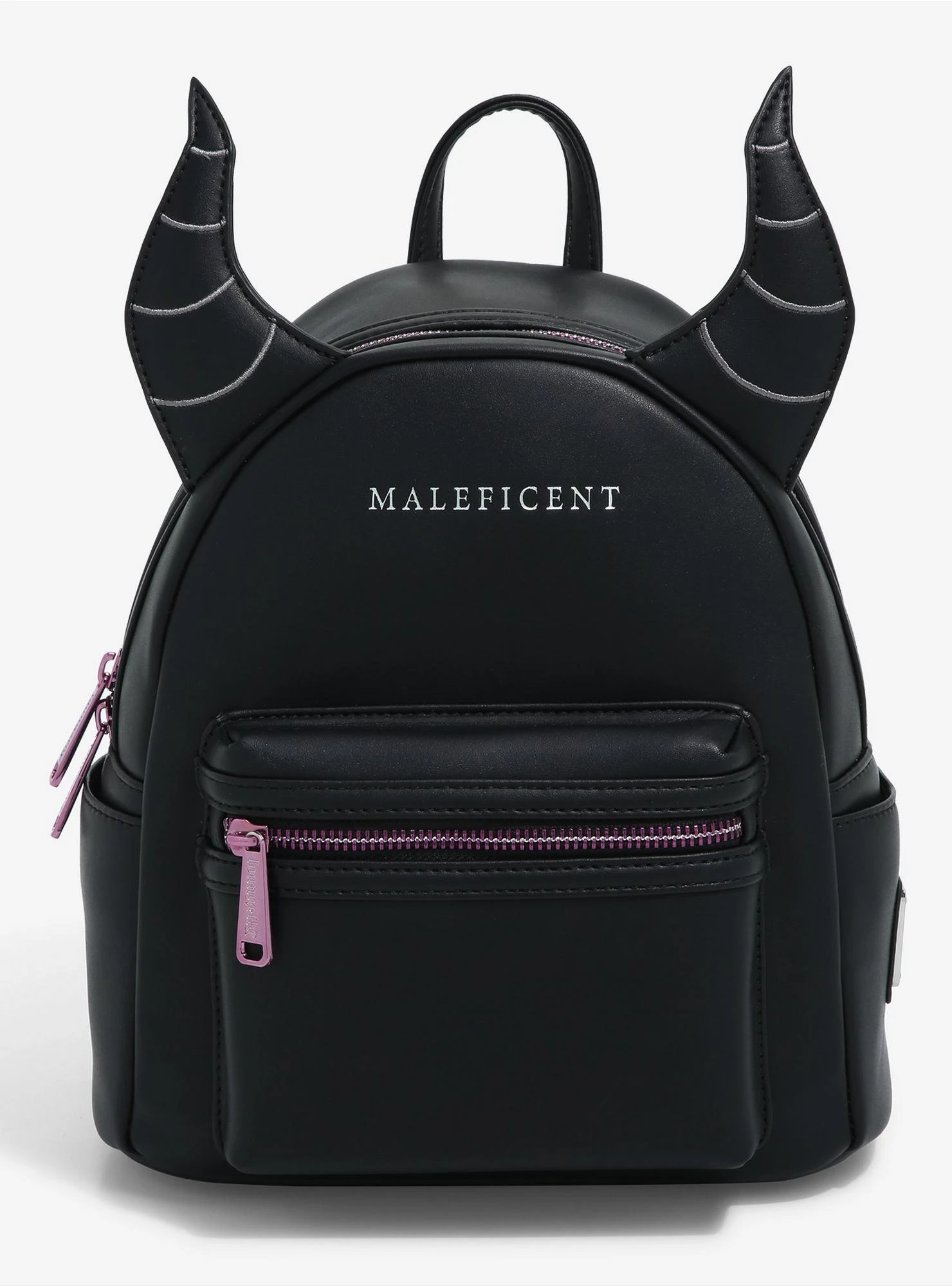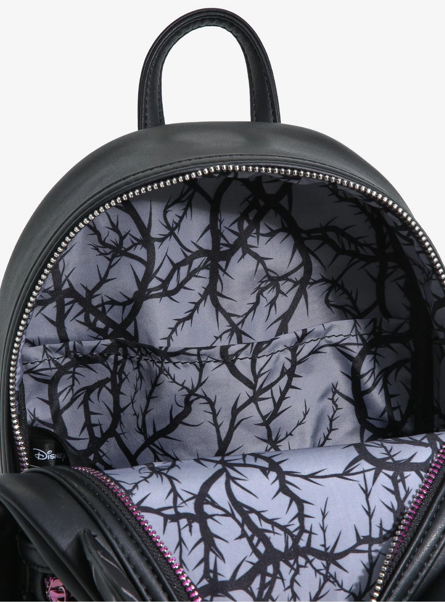 Carry all your dastardly essentials on your next voyage through the forest with this Sleeping Beauty mini backpack from Loungefly! With figural horns on the top and silver-etched “Maleficent” lettering on the front, this Disney bag also features a top handle, adjustable shoulder straps, enamel brand badge, and thorned vine interior lining.